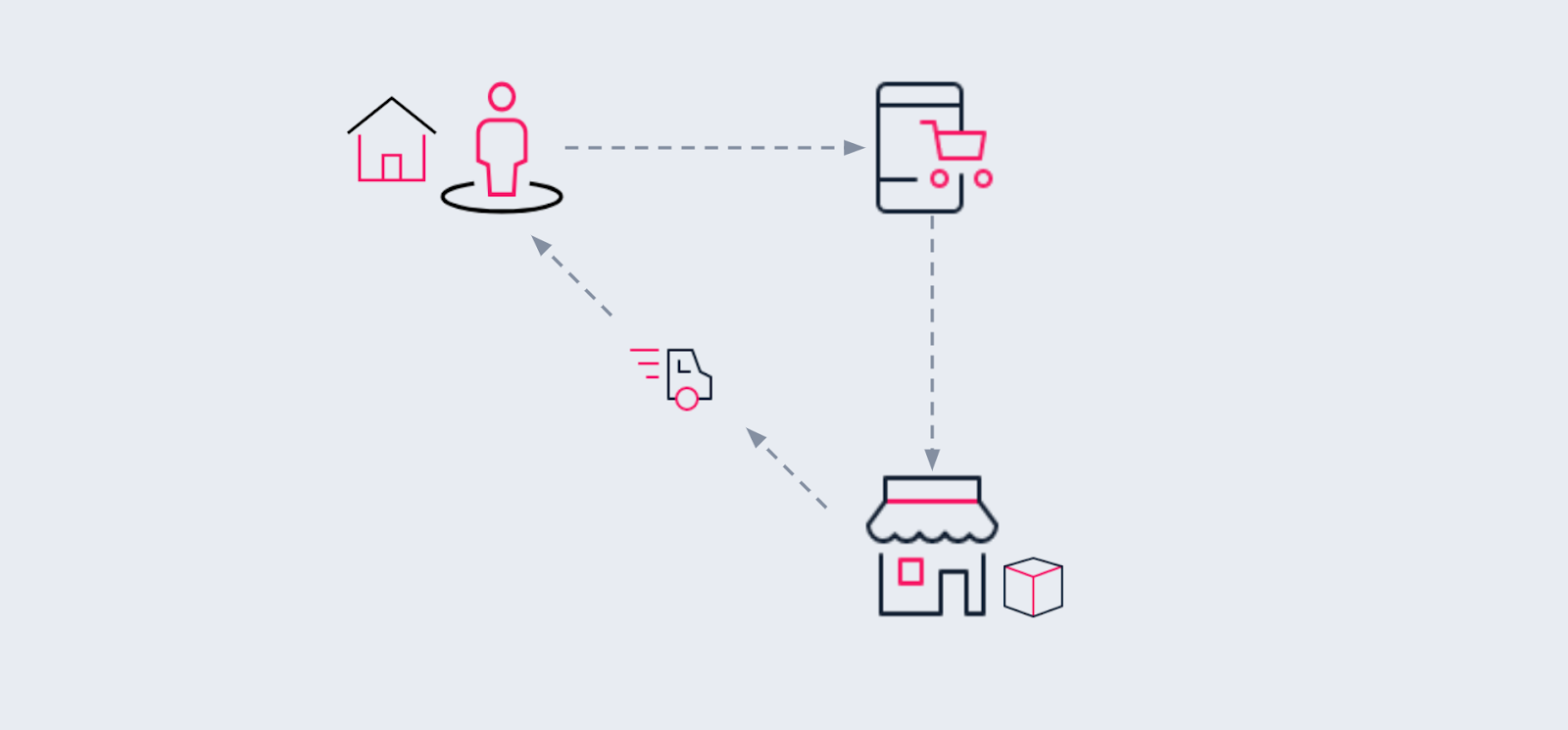 Considere este exemplo: um cliente faz um pedido no e-commerce e deseja receber os produtos em casa. Digamos que você tenha uma loja física no bairro do cliente, a 500 metros da casa dele. Se no estoque dessa loja constam os produtos que ele pediu, a estratégia de Shipping From Store permite que esses produtos sejam enviados para ele a partir dessa loja - por um custo menor para você e com um tempo de entrega mais vantajoso para o cliente.