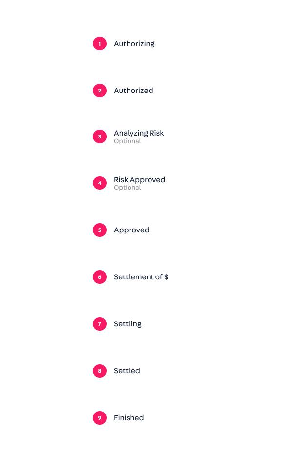 - Risk Approved (optional) (Risco aprovado - opcional): Caso o antifraude responda positivamente, a transação passa para o status de risco aprovado. Se o antifraude identificar algum indício de fraude, a transação é cancelada.