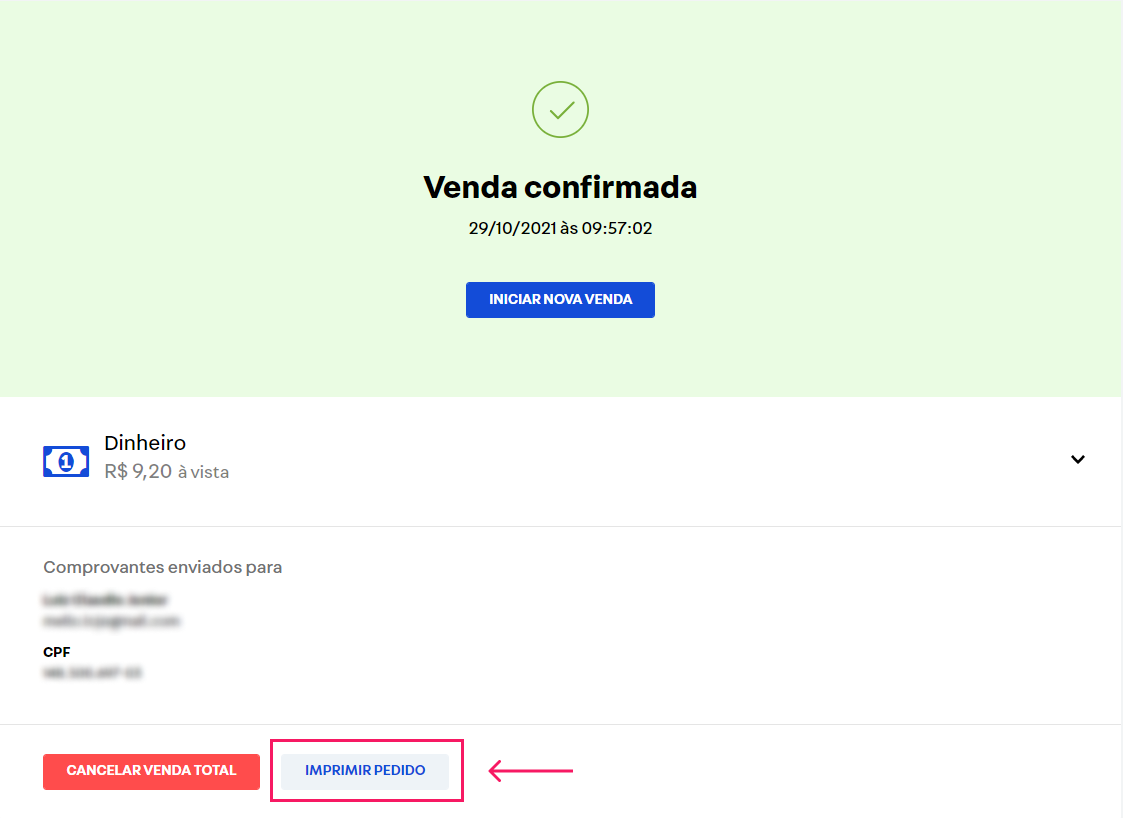 Para isso, o vendedor pode clicar no botão Imprimir Pedido, na tela de pedido finalizado, conforme ilustrado abaixo. Outra opção é configurar o VTEX Sales App para imprimir o resumo do pedido automaticamente, assim que o pedido for finalizado.