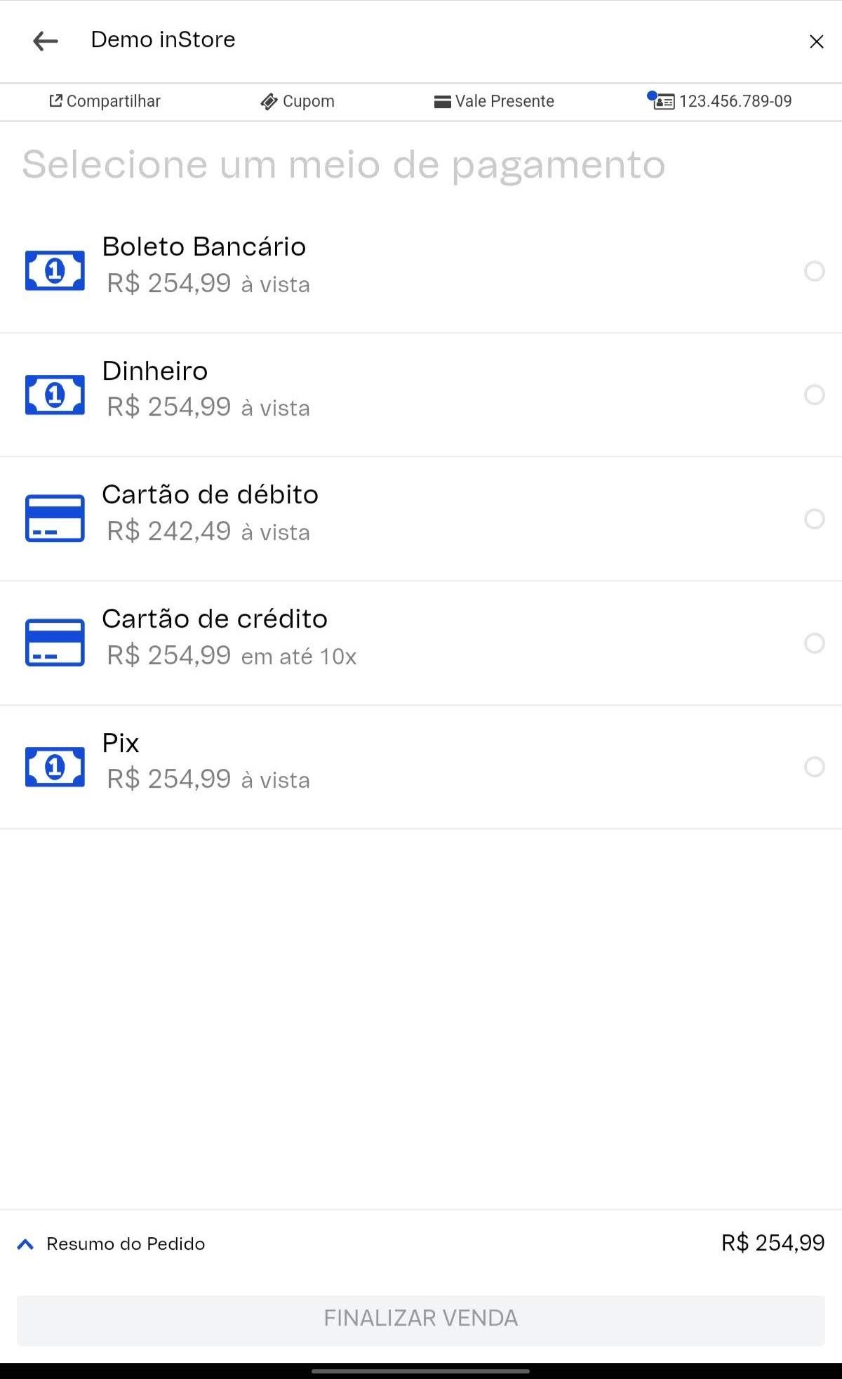 Na etapa de pagamento do VTEX Sales App, aparecerão as opções de pagamento que foram configuradas na sua loja.