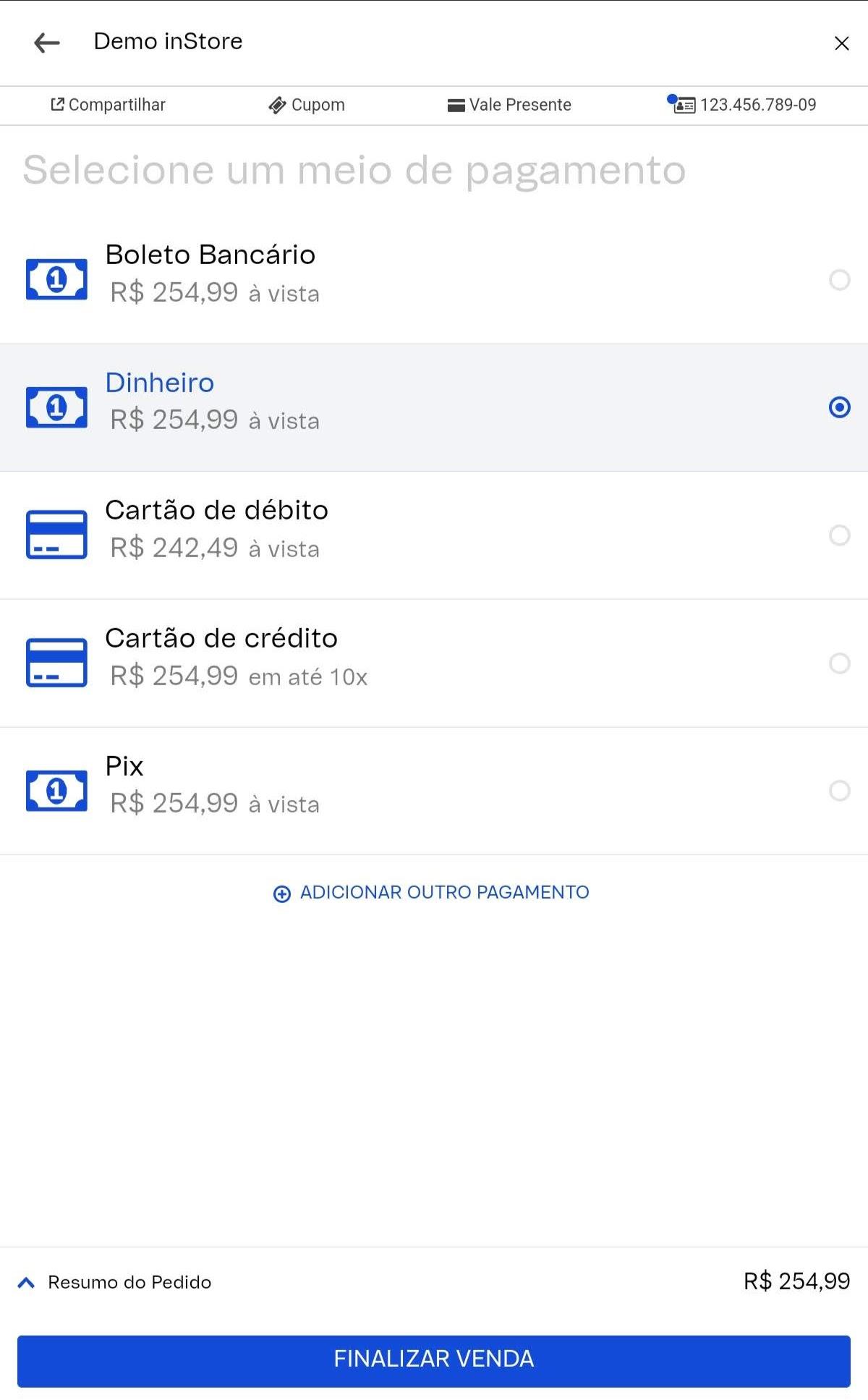 O VTEX Sales App permite selecionar múltiplos pagamentos. Por exemplo: escolhendo Dinheiro e depois clicando em Adicionar outro pagamento, o vendedor pode realizar parte da cobrança em dinheiro e outra parte em cartão de crédito ou débito.