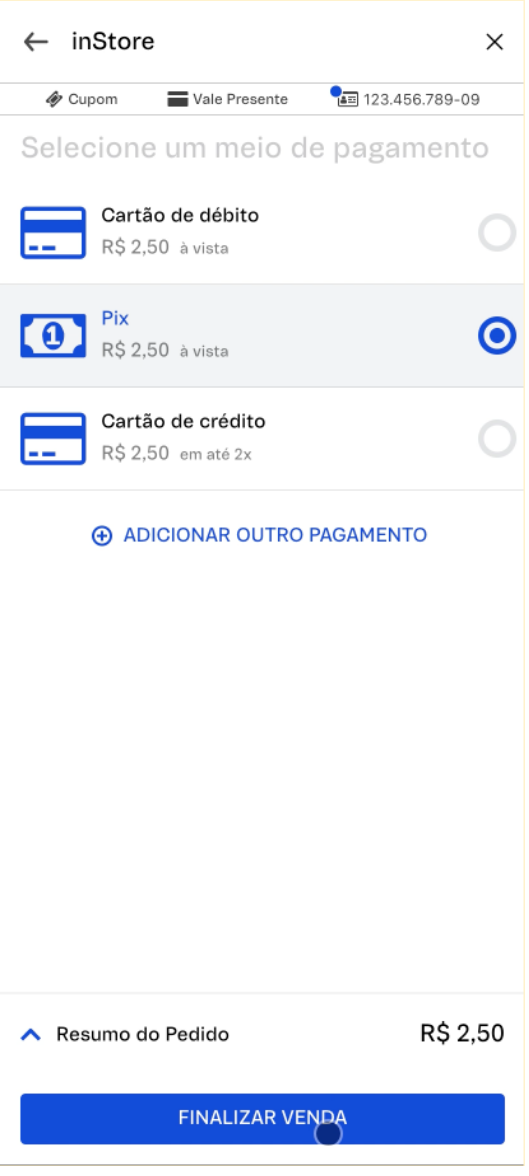 O cliente deve selecionar a opção Pix e clicar em Finalizar venda.