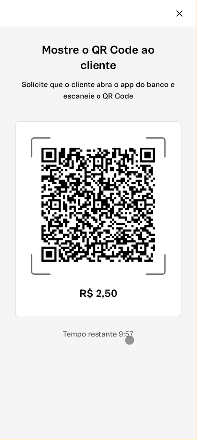 Após finalizar a venda, será exibido o QR Code na tela do VTEX Sales App. O cliente deve escanear esse QR Code com o celular para realizar o pagamento.