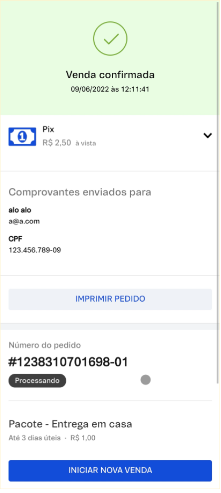 Depois que o cliente realizar o pagamento, a venda será processada e, por fim, confirmada na página do pedido, conforme a imagem abaixo.