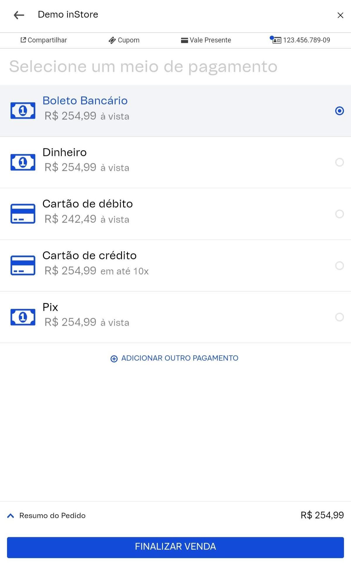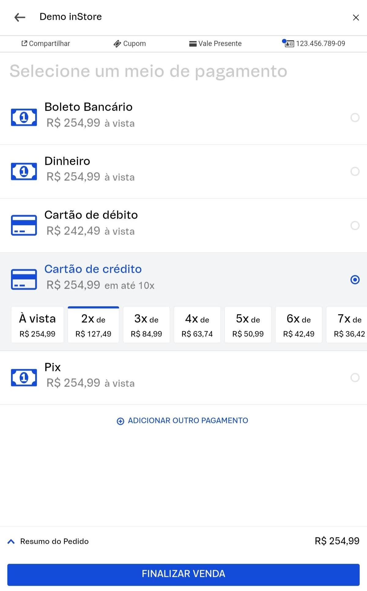Para prosseguir, é necessário selecionar um ou mais meios de pagamento desejados e clicar em Finalizar venda.
