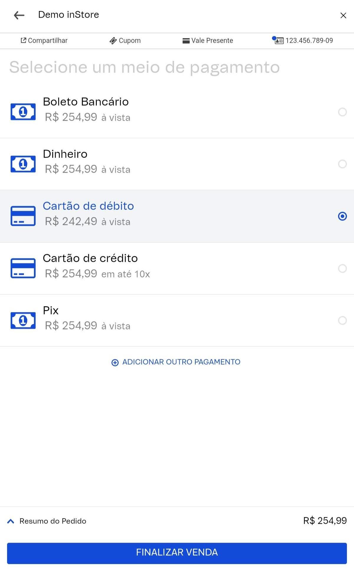 O cliente deve selecionar a opção Cartão de débito e clicar em Finalizar venda.