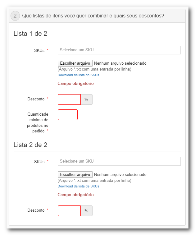 A tela de configuração da promoção oferece duas listas de SKUs, que podem ser adicionados manualmente ou por planilha.