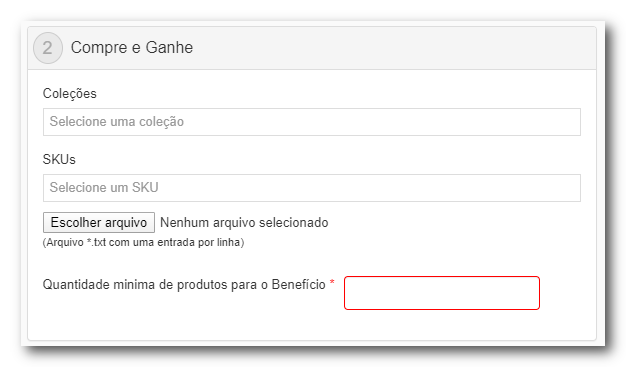O desconto aplicado (frete grátis ou brinde) deve ser definido nos dados gerais da promoção. Depois, a loja deve escolher as coleções ou SKUs aos quais ela será aplicada. E, por fim, deve definir a quantidade mínima de itens no carrinho para a promoção funcionar.