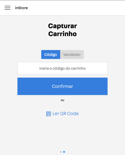Alternativamente, na tela inicial do aplicativo, o vendedor pode simplesmente arrastar a tela para a direita. Ao arrastar a tela para a direita, você verá a tela para Capturar Carrinho, conforme mostra a imagem abaixo.
