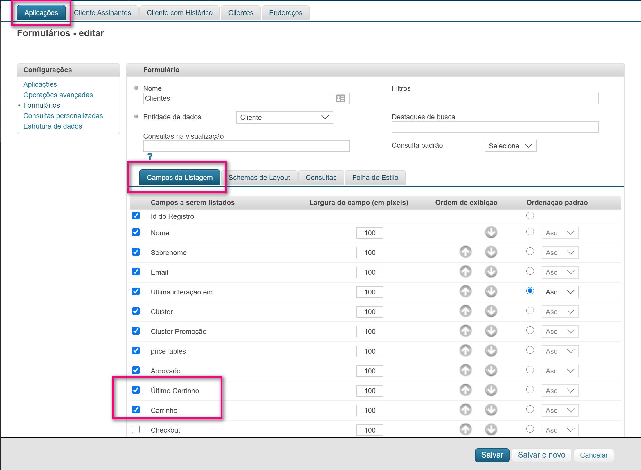 - Selecione as opções “Último carrinho” e “Carrinho” dentre as opções de Campos de Listagens