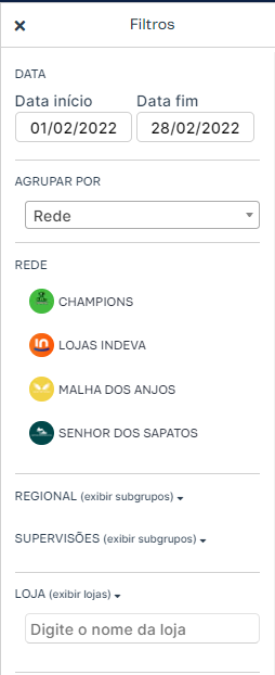 • Metas: filtro por rede, loja e, se disponível, subgrupos.