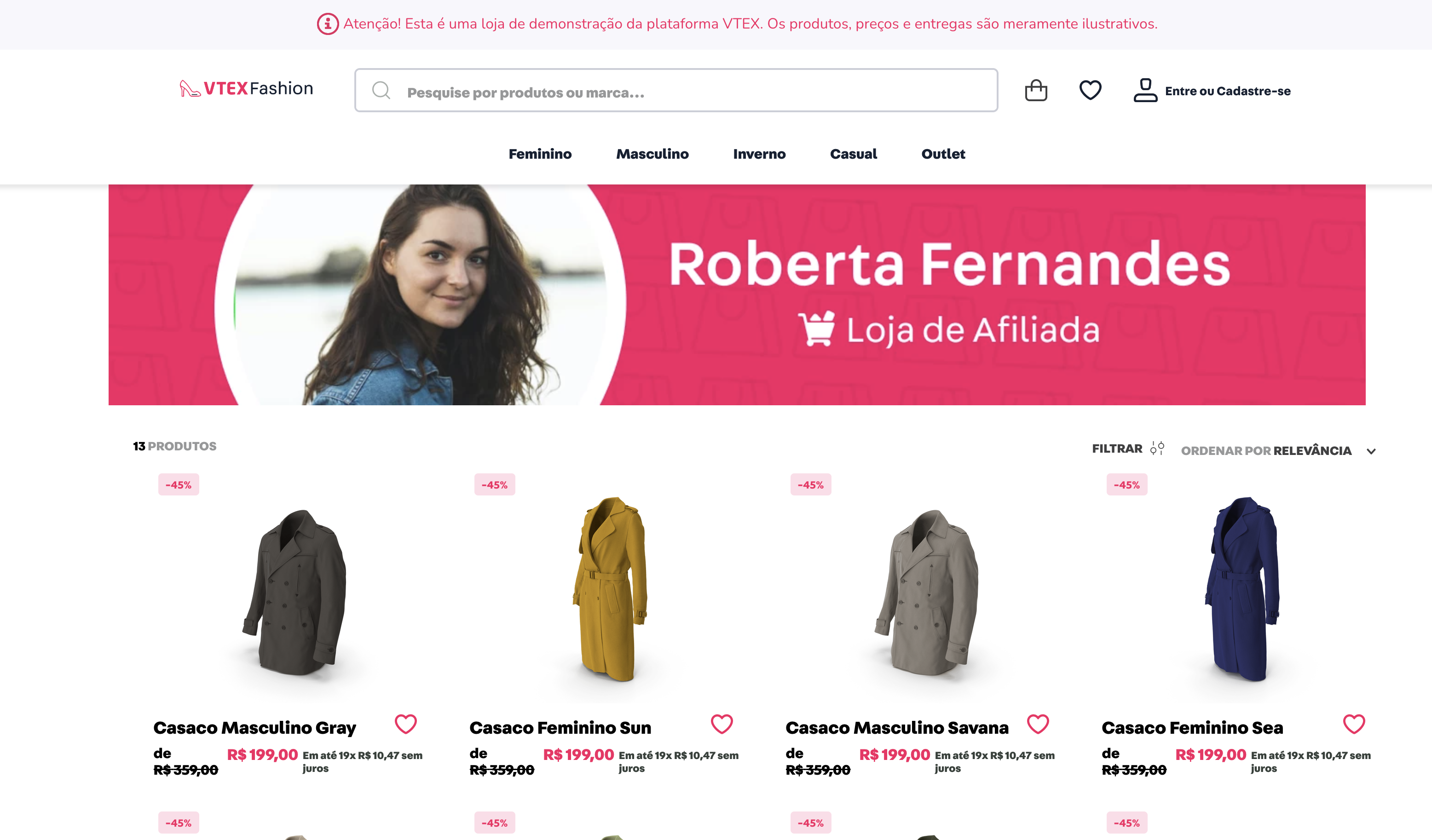 A página do afiliado é a URL da loja VTEX que ele compartilha com os clientes. Veja um exemplo na imagem a seguir: