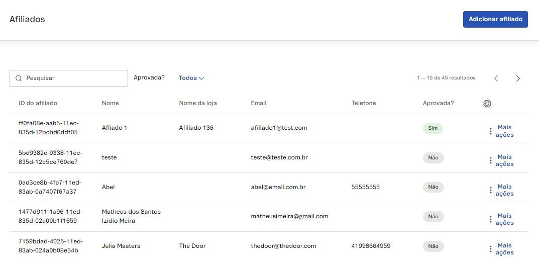 A página **Gerenciamento de afiliados **permite realizar as seguintes ações: