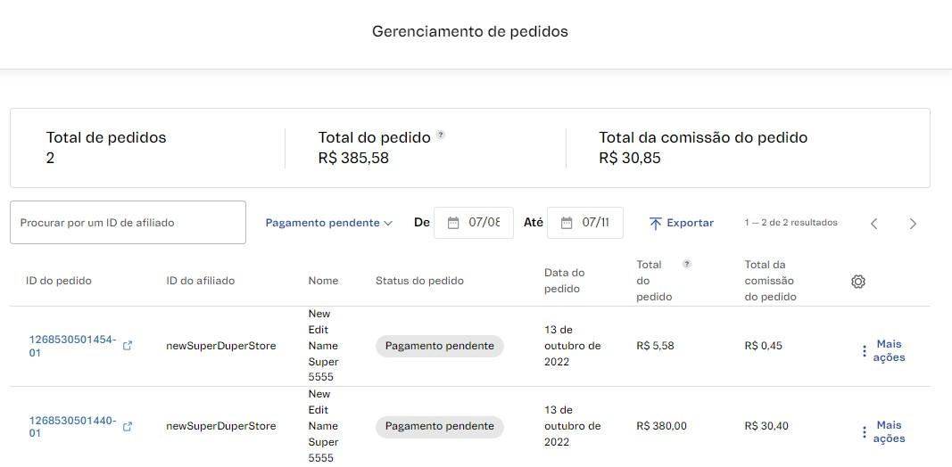 - Total da comissão do pedido: soma dos valores das comissões dos afiliados sobre os pedidos.
