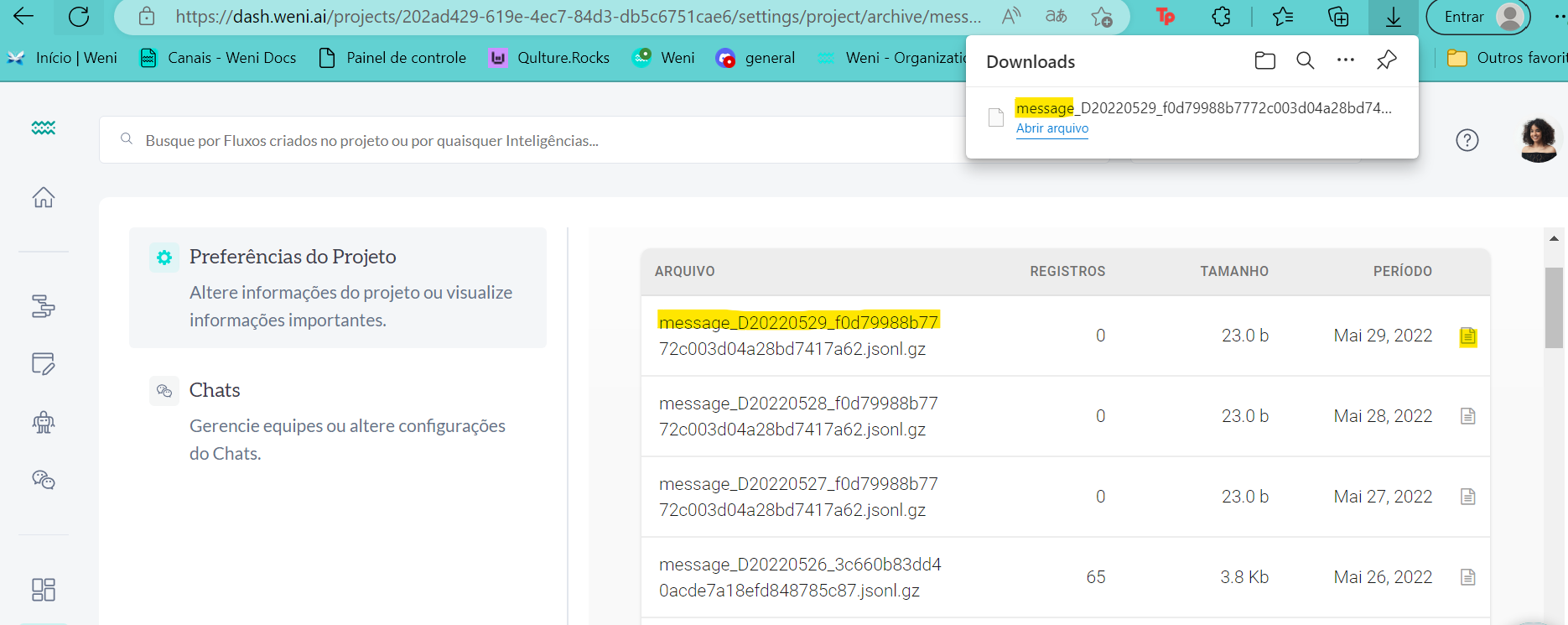 Os arquivos da tabela Messages virão com a inicial message. Para realizar o download dos arquivos, basta clicar no ícone grifado (conforme figura abaixo) ao lado da data.