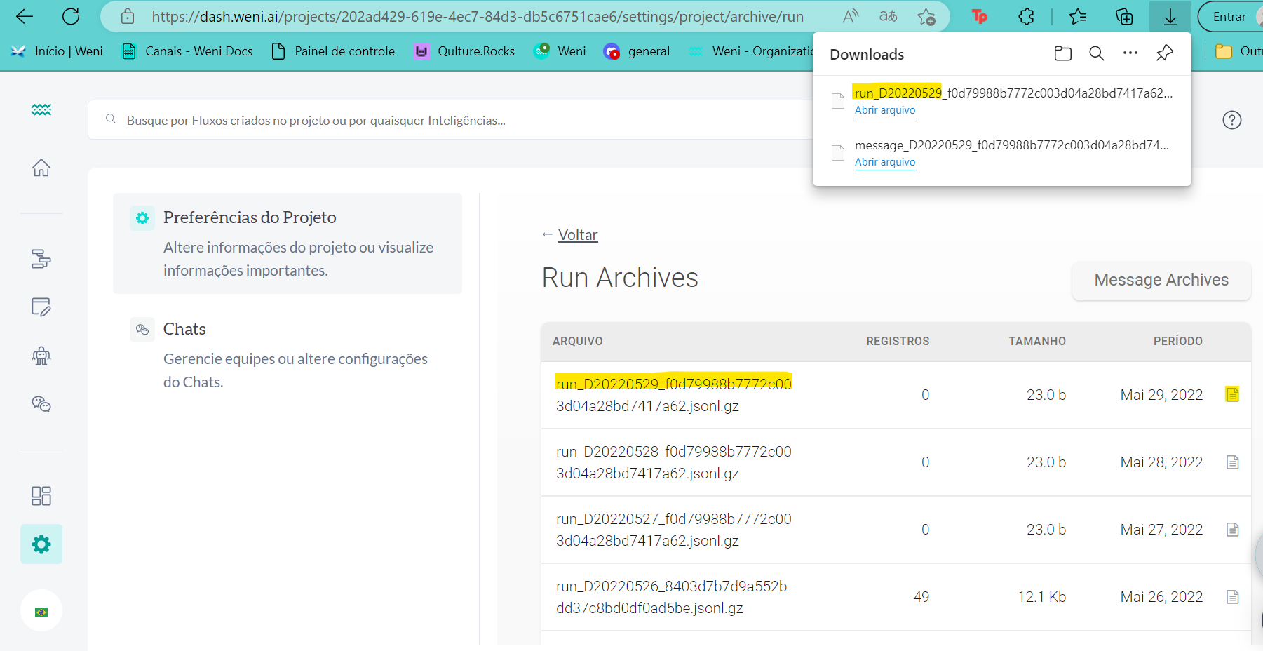 É possível baixar esses dados arquivados acessando o painel de configurações. No final da página informará a quantidade de arquivos e seus registros, conforme imagem a seguir: