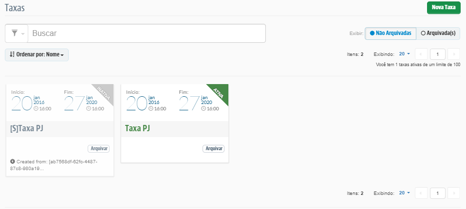 Validade: data e hora de início e de fim da taxa. Pode ser usada uma data e/ou horário futuros, para que a taxa comece a ser aplicada no site. Caso seja configurada dessa forma, a taxa terá o status de agendada até que a data e horário sejam atingidos. Enquanto a taxa estiver válida, esta terá o status de ativa e ao término da data e hora definidos, o status será alterado para inativo automaticamente.