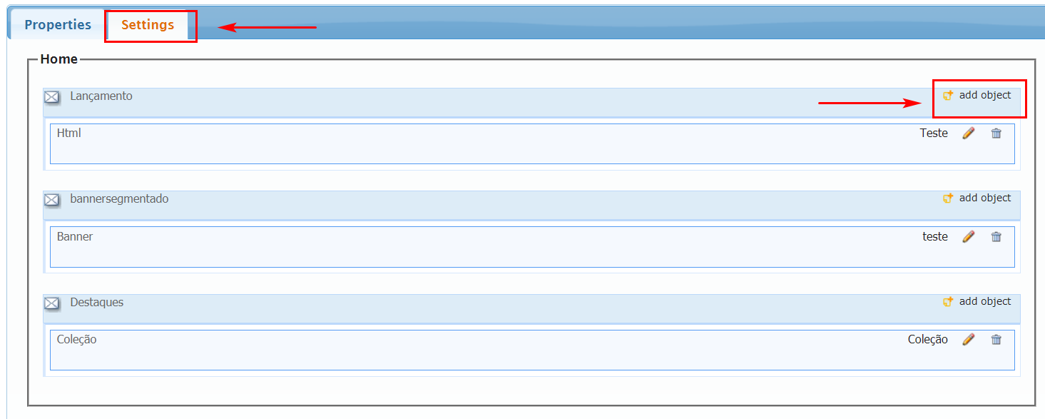 No exemplo a seguir, iremos definir a vitrine apresentada na Home, para isso, selecione Settings, depois add object, conforme na imagem a seguir.