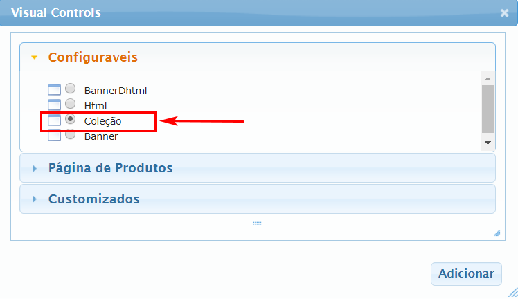 Esse comando irá abrir o Visual Controls, ou seja, o controle correspondente à vitrine em que se deseja exibir a coleção. Adicione uma Coleção, porém não se esqueça de definir um nome para ela.