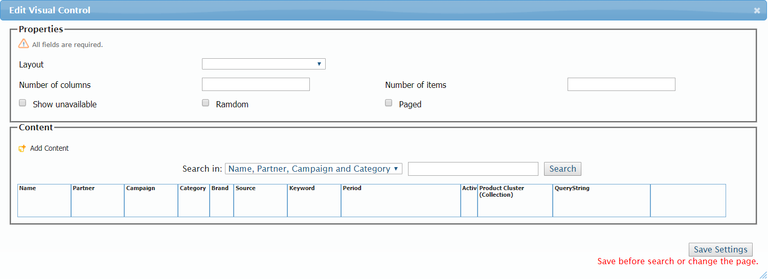 Ao editar o controle é necessário adicionar seus conteúdos, que representam cada conjunto de itens que serão exibidos. São eles: Layout: Selecione o template de prateleira utilizado na vitrine. Number of Columns, Number of Items,Show Unavailable, Ramdom ad Paged: Definem a disposição, quantidade e qual o critério de exibição dos itens.