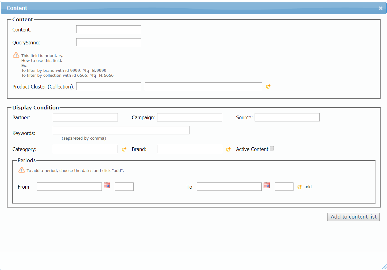 Os conteúdos a serem preenchidos na parte Display Condition: Partner, Campaign e Source: Definem a exibição deste conteúdo, caso o visitante possua alguma UTM correspondente em sua URL de origem. Keywords: Vincula a exibição do conteúdo a uma busca por termo(s) específico(s). Category e Brand: Vincula a exibição do conteúdo em uma página de Categoria e/ou Marca específico(s). Peridos: Define o período em que o conteúdo ficará ativo.