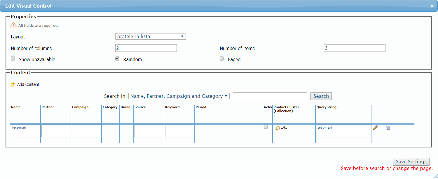 Os conteúdos a serem preenchidos na parte Content: Content: Nome que identificará cada conjunto de itens QueryString: Os parâmetros preenchidos nesse campo definem o resultado de busca que será exibido neste conteúdo.