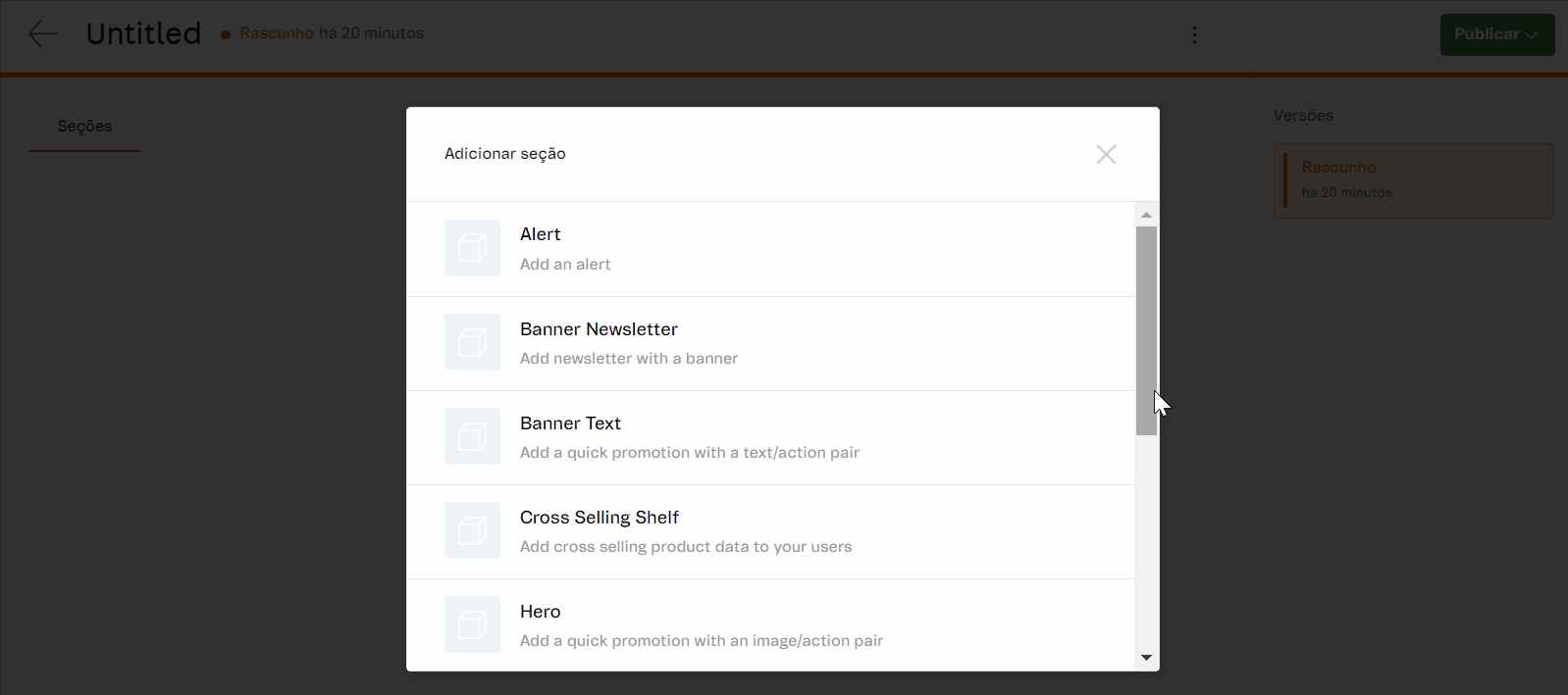 | Criar documento | Cria uma nova página baseada nas opções disponíveis, por exemplo, Product Page ou Home. |