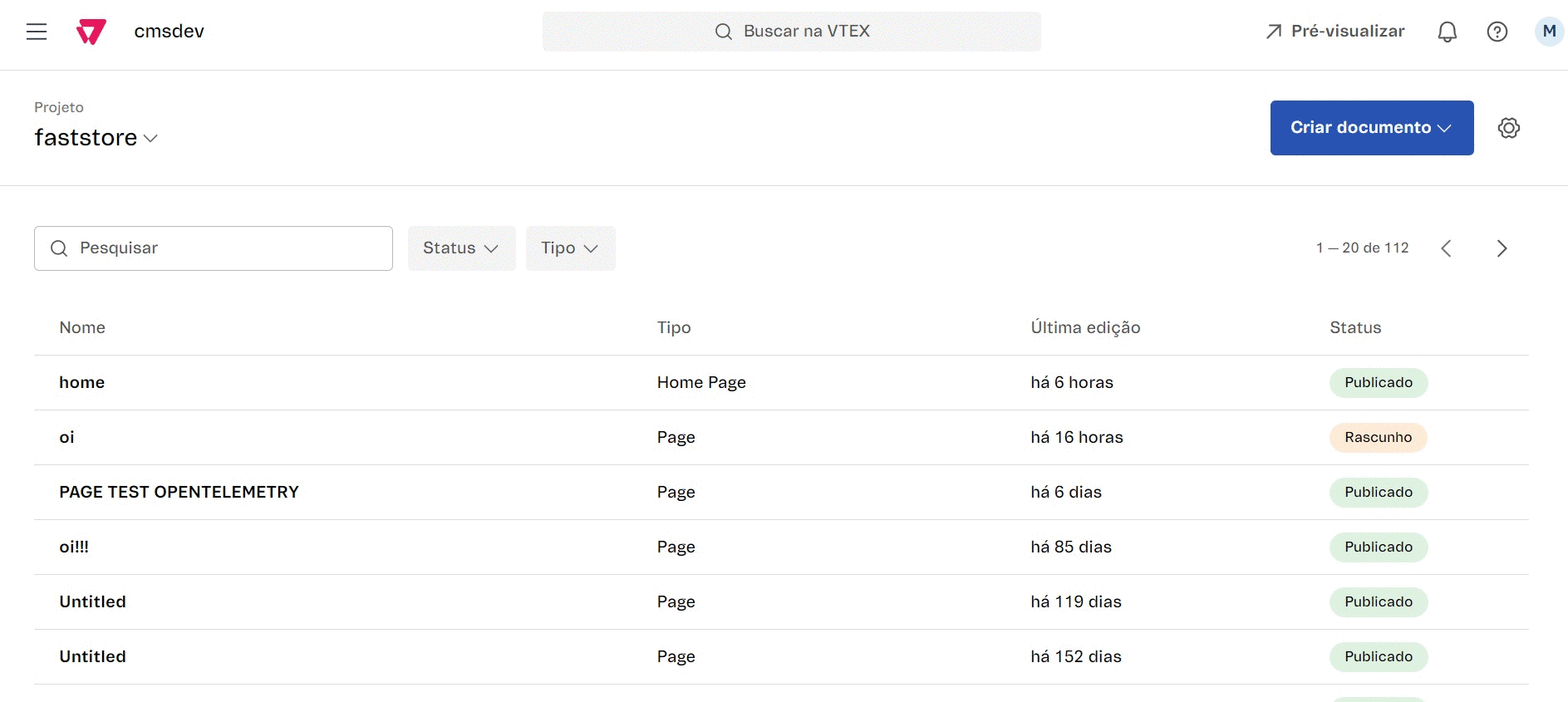 Em cada projeto, você também pode gerenciar todas as rotas de URL e modelos de página para o site de sua loja, incluindo a página inicial, a página de produto (PDP) e outras. Para obter mais informações, consulte Gerenciando Páginas no Headless CMS.