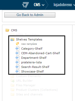 As prateleiras são estruturadas a partir de código HTML, organizados em templates(arquivos que estruturam código) específicos, chamados de Shelves Templates. Eles estão localizados na pasta de CMS, no módulo Layout. É nessa pasta que você vai poder criar novos templates e editar os que já existem.