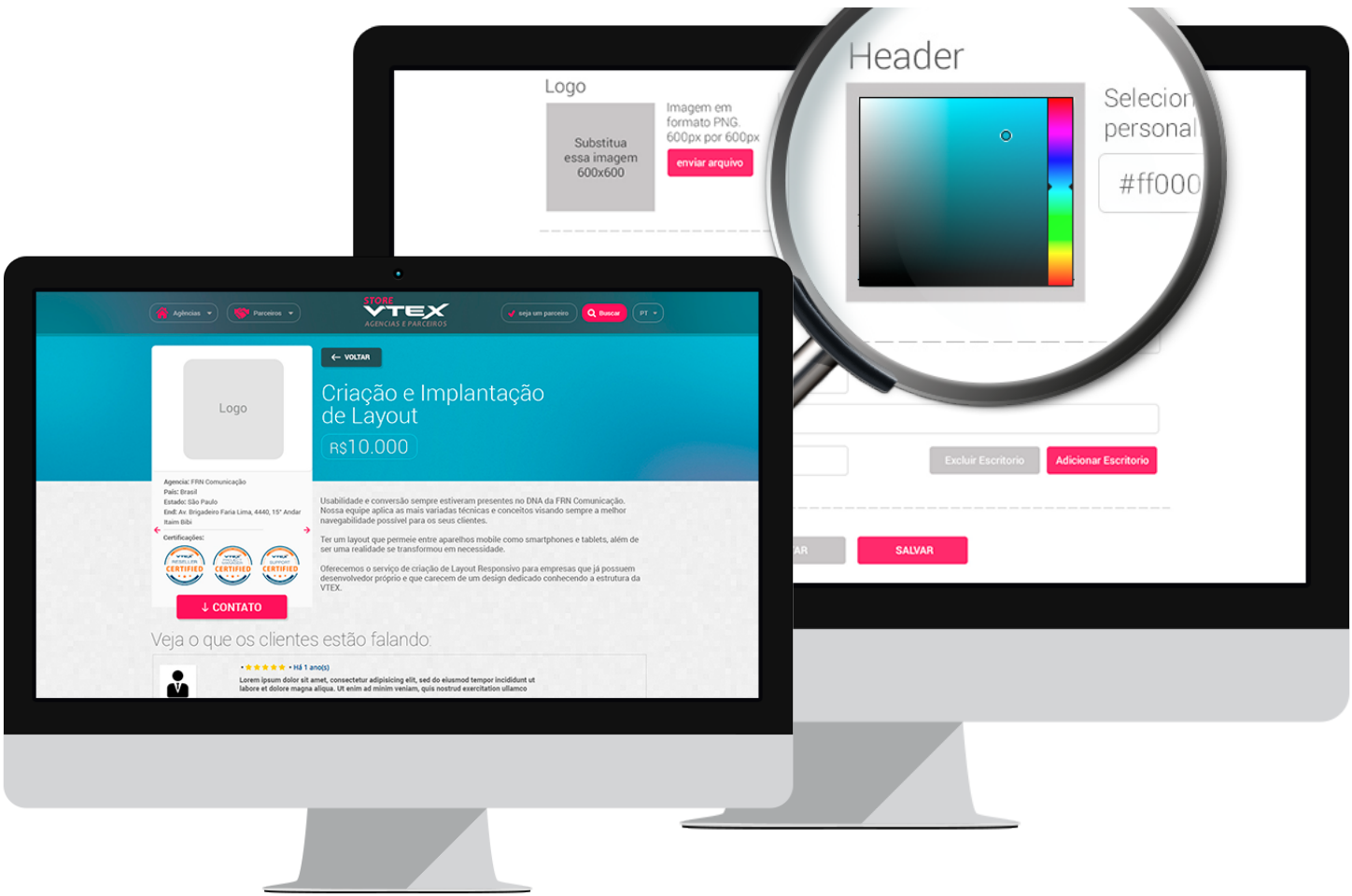 No primeiro passo temos alguns campos que merecem atenção, o primeiro é a cor do header. Onde se aplica? Na VTEX STORE dentro da pagina da sua agencia como é demonstrado ao lado.
