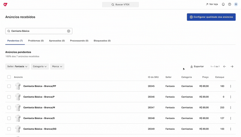 Vale ressaltar que as opções de filtros se dão conforme os SKUs disponíveis na listagem. Suponhamos, por exemplo, que o marketplace está conectado aos sellers A, B e C, mas somente existem SKUs dos sellers B e C pendentes. Isso significa que a seleção de filtro na seção Pendente exibirá apenas os resultados dos sellers B e C.