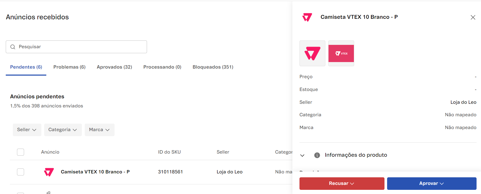 Na seção Pendentes, o marketplace encontra a lista de todos os anúncios enviados por um seller e que ainda não foram aprovados. Os anúncios podem ser filtrados por Seller, Categoria e Marca. Também é possível realizar as seguintes ações em anúncios desta seção: Criar novo produto, Associar a produto ou SKU, Recusar para correção ou Recusar e bloquear.