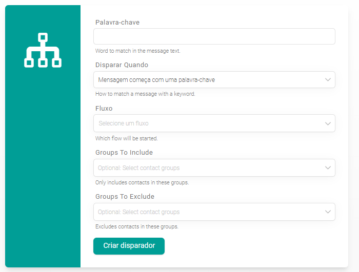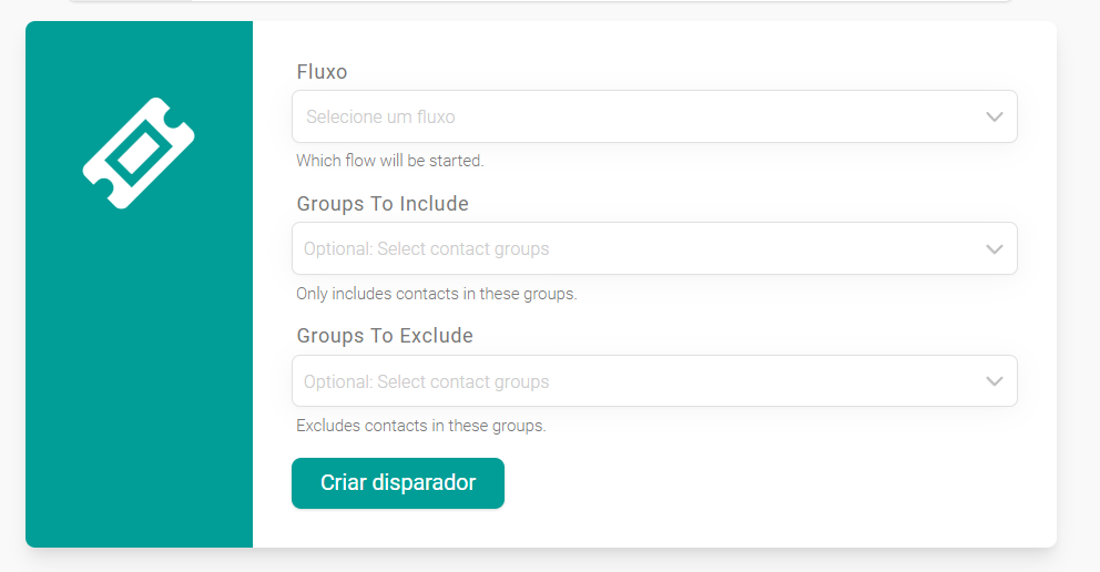 • Em apenas grupos, é possível incluir ou não incluir as regras desse gatilho a grupos de contato específicos, basta deixa o espaço em branco se você quiser aplicar essa regra a todos os usuários