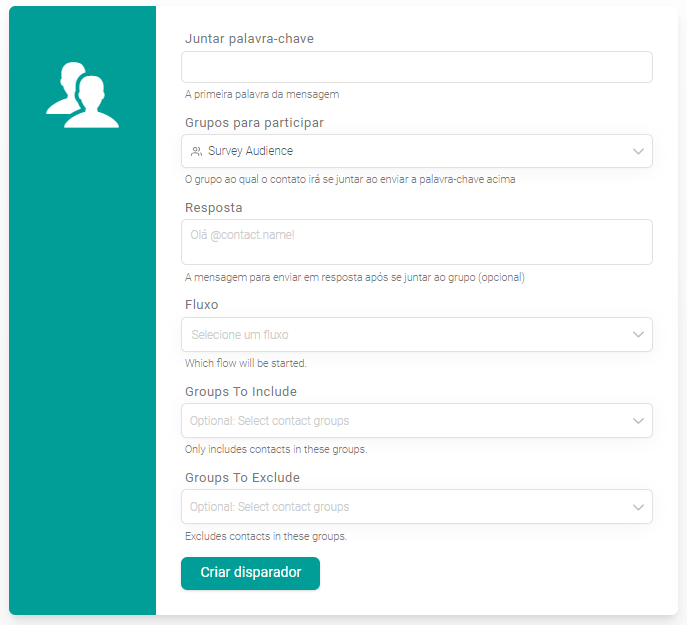 Para criar um gatilho com uma palavra-chave que une contatos a um grupo: