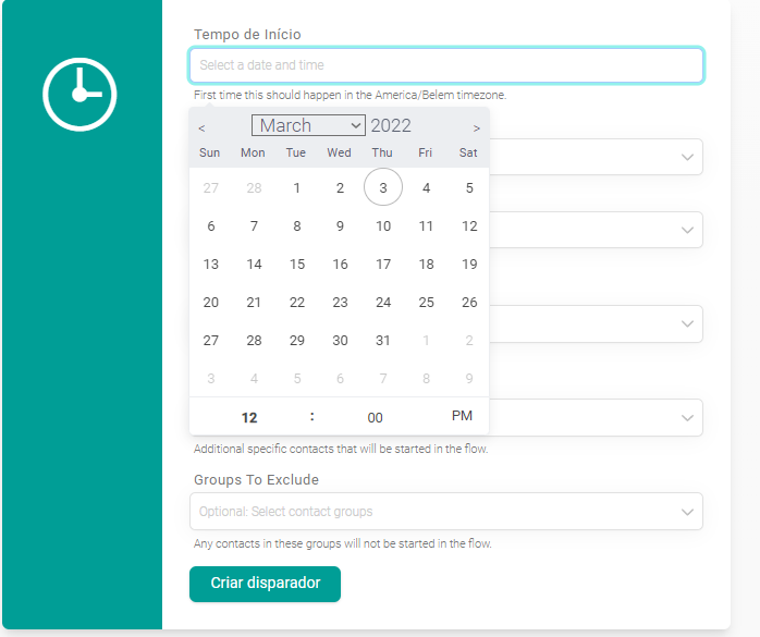 Use este gatilho para agendar um fluxo em um momento no futuro, o repita diariamente, semanalmente ou mensalmente. Para iniciar o fluxo no futuro ou de forma programada: