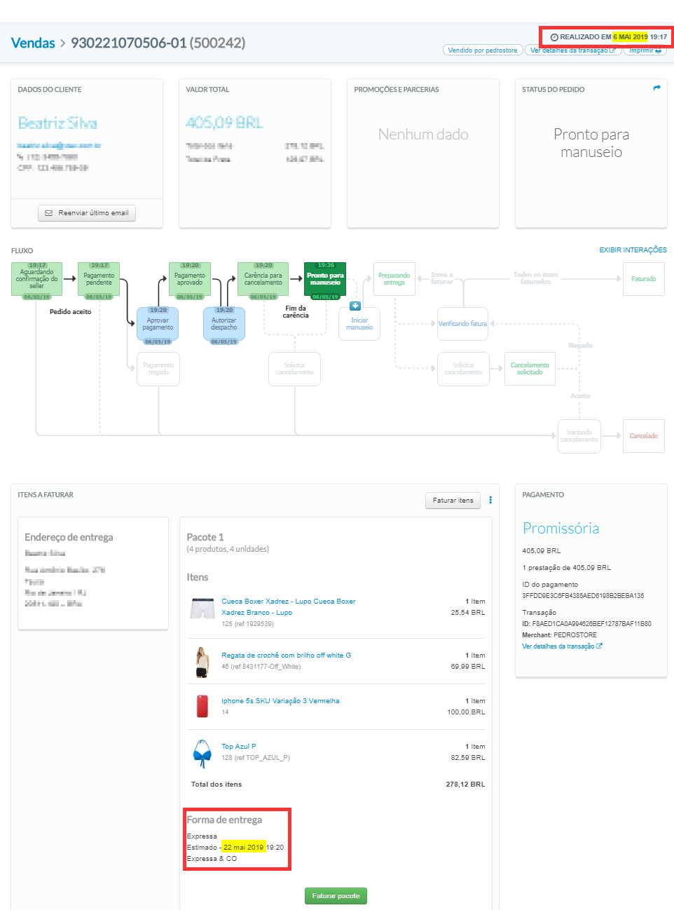 No canto superior direito, você vê a data em que o pedido foi realizado (6 MAI 2019). E na seção de Itens a Faturar em baixo, você vê o prazo de entrega do pedido (22 MAI 2019).