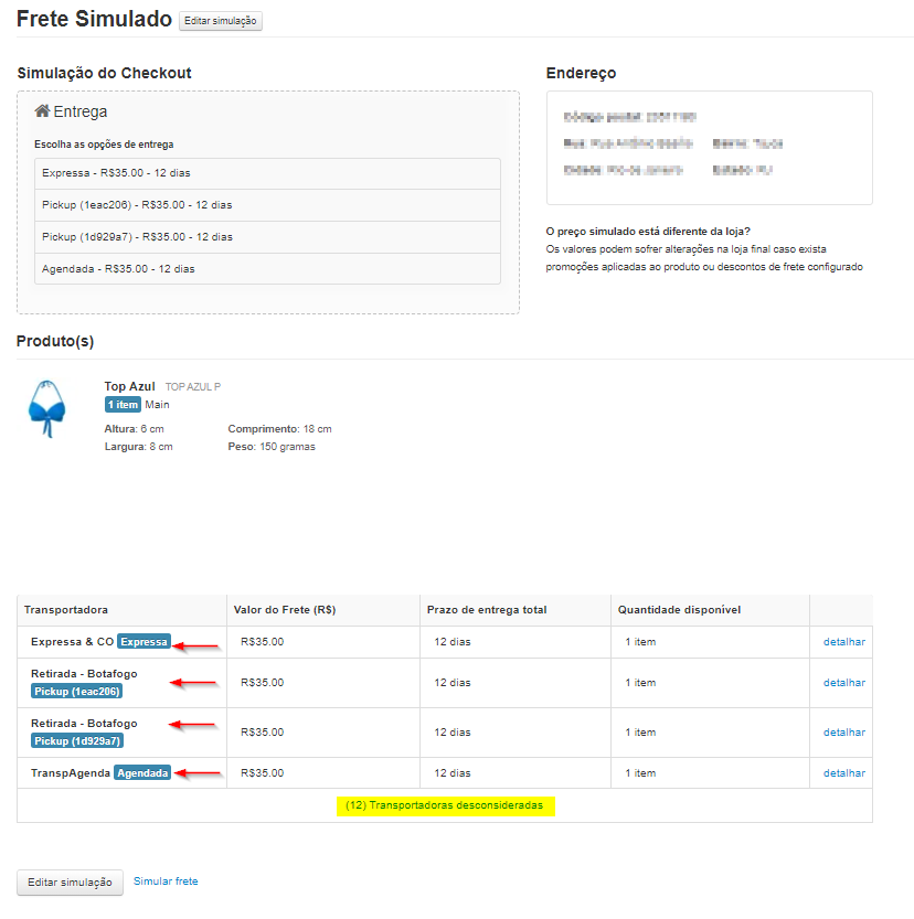 Portanto, voltando à simulação de frete, no módulo Envio, concluímos que a primeira opção foi a escolhida nesse pedido - e que, portanto, o prazo de entrega total do pedido foi de 12 dias.