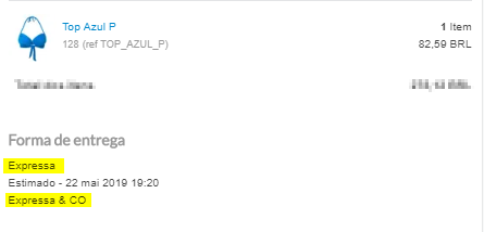 Consultando mais uma vez a tela de detalhes do pedido, vemos que o tipo de entrega escolhido pelo cliente para esse pedido foi o Expressa, e que a transportadora escolhida pela plataforma para realizar esse pedido foi a Expressa & CO.
