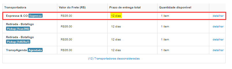 No exemplo abaixo, note que 4 transportadoras foram consideradas, e 12 foram desconsideradas.