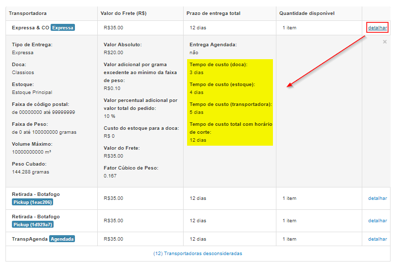 Agora basta clicar em detalhar para ver os tempos de custo que foram usados no cálculo desse prazo de entrega.