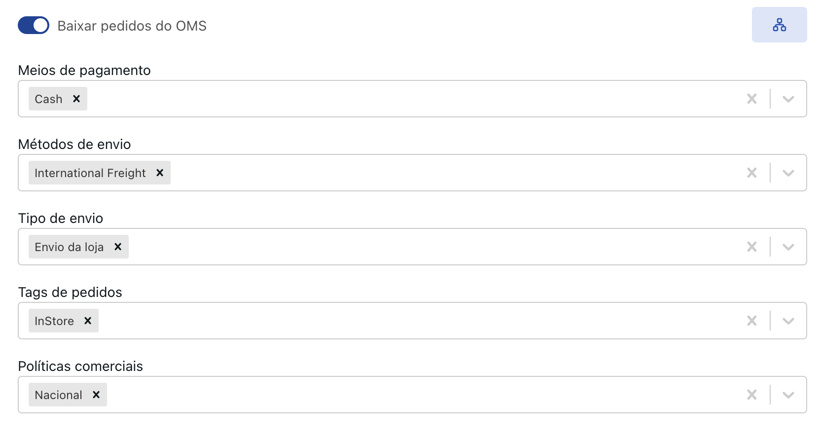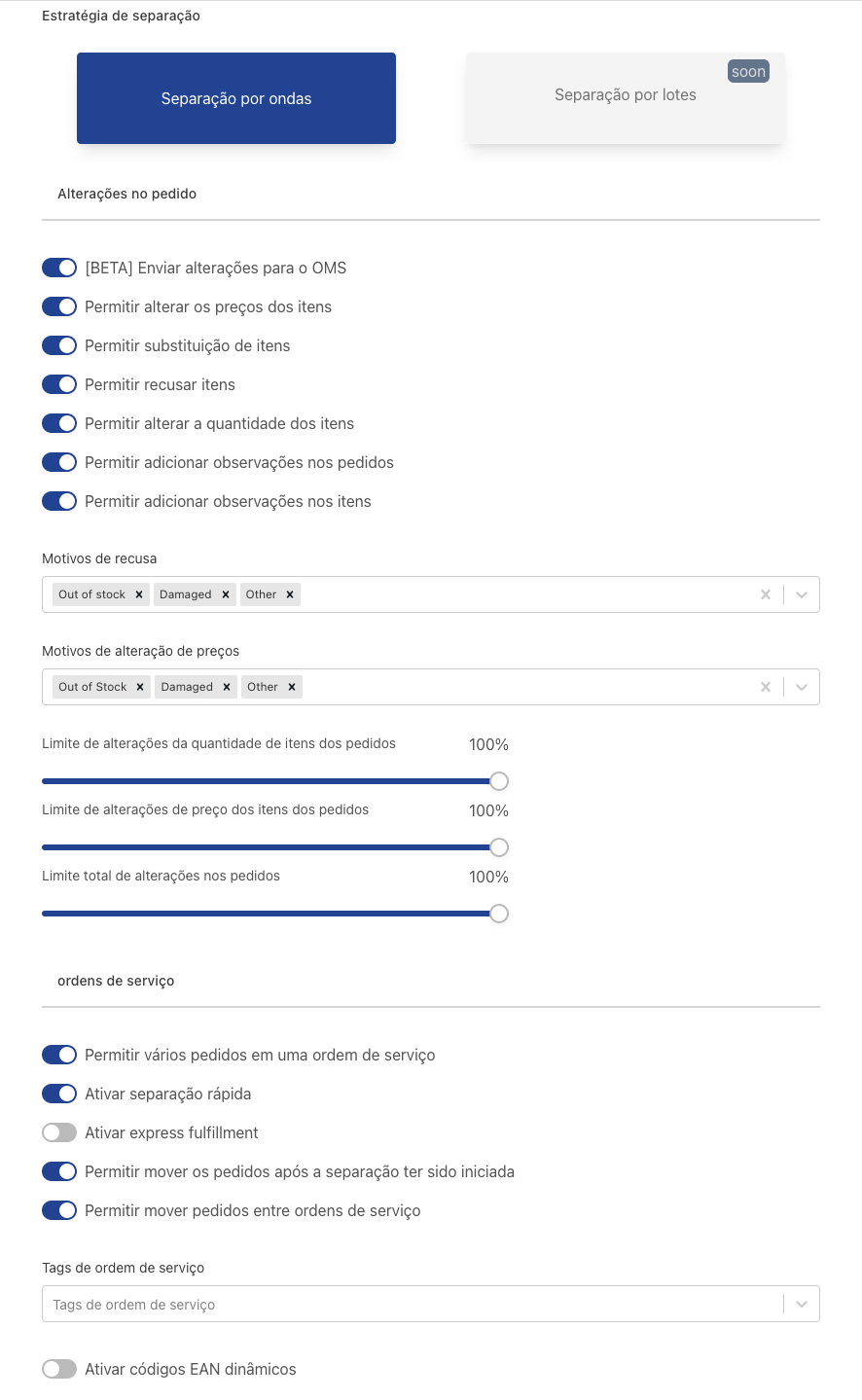 • Enviar alterações para o OMS: permite enviar as alterações feitas pelo separador para o OMS da VTEX. Você pode ativar ou desativar a opção.