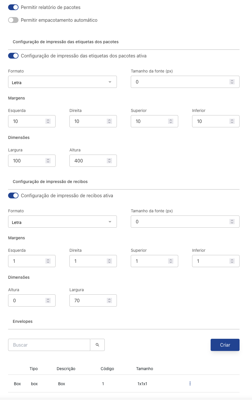 • Configuração de impressão das etiquetas dos pacotes ativa: ativa ou desativa a possibilidade de editar as características das etiquetas.
