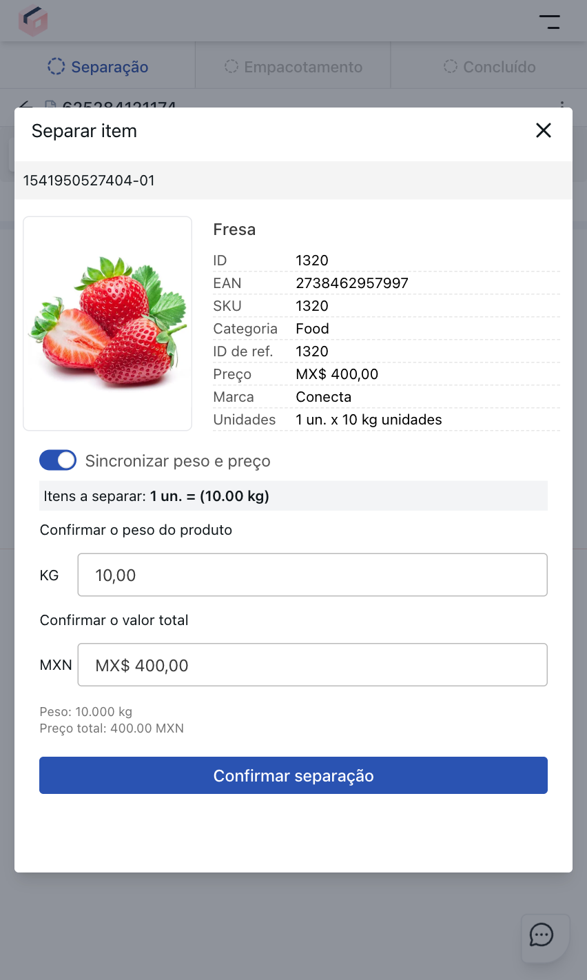 Para itens que contém peso ou volume é preciso confirmar a medida e depois confirmar a seleção, como apresentado no exemplo abaixo: