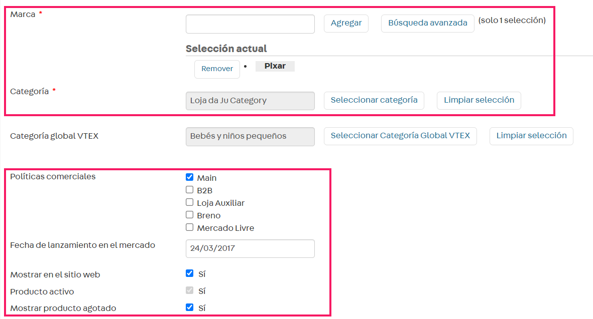 • Tener asociadas y activadas la marca y la categoría.