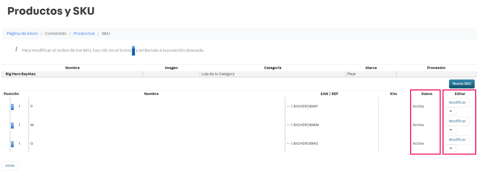 5. Si algún SKU está con el status Inactivo, haz clic en Modificar para ver la información detallada del SKU.