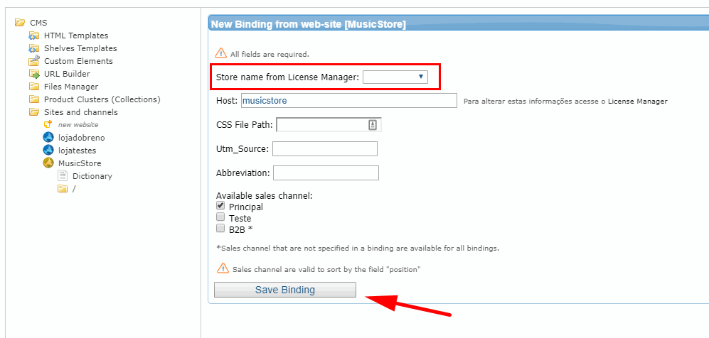 - Na tela que aparecerá em seguida, o campo Store name from License Manager estará em branco. Clique na seta que aparece nesse campo e selecione o nome da sua loja.