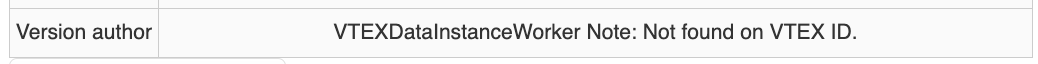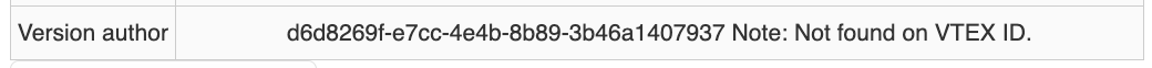 • Verifique o "Version author", que será um ID de usuário, e o nome "Note: Not found on VTEX ID.", por exemplo:
