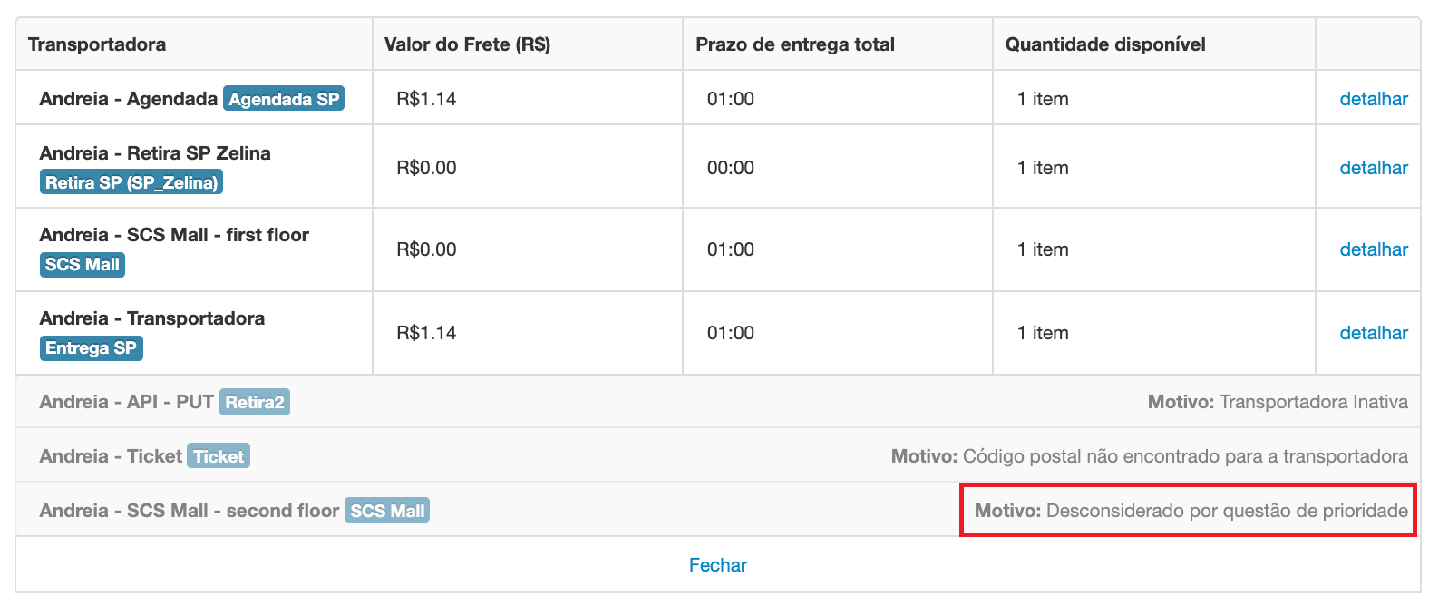 - Evitar utilizar o mesmo nome para dois métodos de envio de pontos de retirada que atuem na mesma região. Por exemplo, no caso da simulação descrita, a solução seria renomear um dos métodos de envio**.**