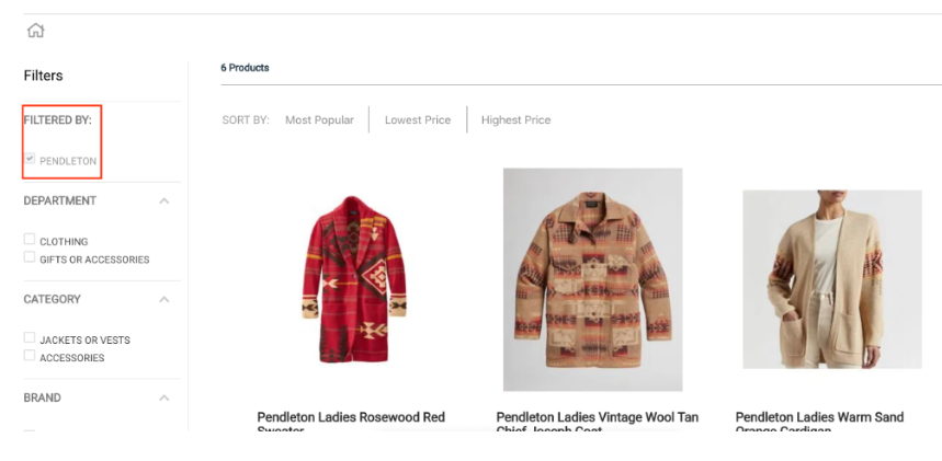 {"route": {"from": "/Pendleton","declarer": "vtex.store@2.x","type": "fullText","id": "2000307","query": {"map": "ft"},"origin": "user-canonical"}}O valor ft (full text) ao invés de b (brand) no parâmetro map indica que produtos em que o termo Pendleton esteja presente no nome ou na descrição também passarão a ser exibidos na busca.