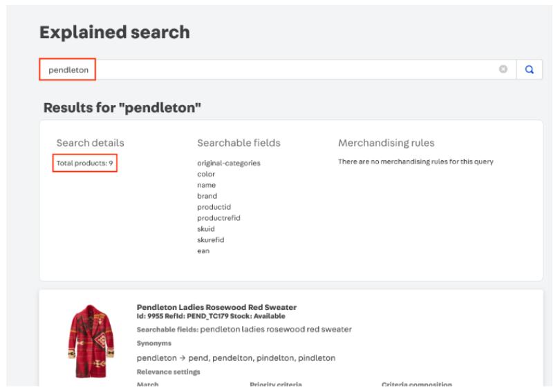 Cenário de exemplo: ao pesquisar no site da loja por produtos que contenham o termo "Pendleton", o resultado da busca exibe 6 produtos. Entretanto, quando acessamos o Admin VTEX (Storefront > Intelligent Search > Explicação da busca) e digitamos o mesmo termo, são apresentados 9 produtos.